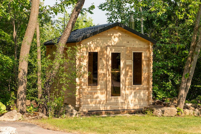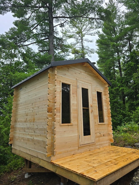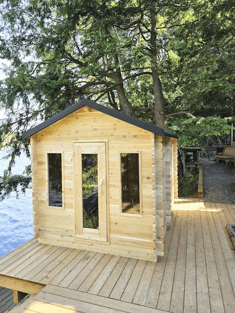 A classic outdoor cabin sauna kit crafted from Canadian white cedar, designed to provide a spacious, stylish, and authentic sauna experience.